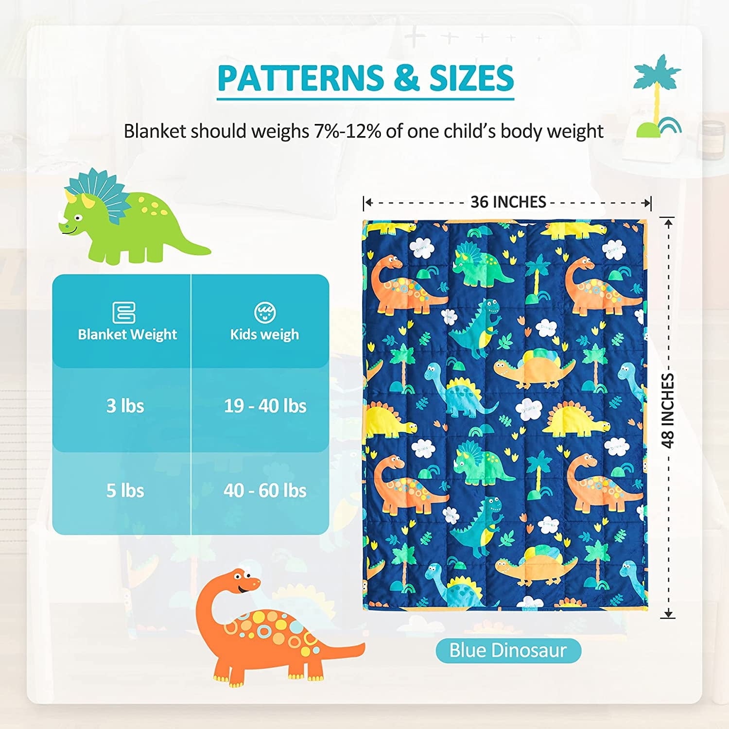 "This weighted toddler Blanket is 3 lbs, Super Soft Cotton , 36 x 48 Inch Blue Dinosaur 2 in 1 Kid’s Comfort Set for A Good Night’s Sleep this weighted blanket integrates high count cotton top and fuzzy fleece reverse to offer all season comfort for your little ones. Ultra soft exterior with glass beads insert provides sensory pleasures to promote deep sleep for your kids. Dual sided design is suitable for uses around the seasons. All Purpose Calming Blanket The blanket is ideal for both bed-time and quality down time in and out of the house. Wrap it around your little ones while they are watching TV, reading, playing games, or on the road to nurture feelings of safety and comfort. Certified as safe for kids, it truly is the security blanket for you and the children. Well Cushioned Beads Double stitched hemming secures the beads while 8 high-strength ties attach to a duvet cover for a neat and snug fit. Premium quality makes sure the blanket stays new and intact for years to come. Smaller Quilt Pockets The compact 4"" by 4” pockets disperse the beads and weight evenly around the body. The weighted blanket featuring crispy cotton top and minky dot fleece reverse calms the kids and helps with fast sleep. Double sided children’s blanket provides skin-to-skin calming sensation. Reactive dyeing process makes the color look fresh and new after washes. This blanket is available with dinosaur, kitten, unicorn, crocodile, and plane cartoons. Let the blanket hug your children with its comforting pressure so that they can sleep through the night, and in turn giving you a better sleep." *- Premium Material: This weighted blanket is made of 100% breathable natural cotton, which would make it cooler and more durable than normal blanket. The filling is environmental non-glue polyester padding and Hypo-allergenic,odorless Glass Beads. *- Promote Deeper Sleep: Naturally calm down the children and promote deeper sleep by simulating the feeling of being hugged.
